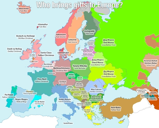 Ένας χάρτης που κυκλοφόρησε πρώτα στο Reddit και μας ενημερώνει “ποιος φέρνει τα δώρα των εορτών” στις διάφορες χώρες της Ευρώπης. Ή, αν προτιμάτε, πώς λέγεται ο Άγιος Βασίλης στις υπόλοιπες χώρες της ηπείρου μας.