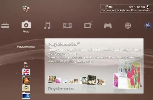 Τώρα, είναι πλέον παιχνιδάκι να εξερευνήσετε και να απολαύσετε έναν νέο κόσμο 3D πανοραμικών εικόνων στο δικό σας PlayStation3 και την 3D BRAVIA– ή οποιαδήποτε άλλη 3D τηλεόραση. Το PlayMemories είναι μια νέα εφαρμογή για το PS3, η οποία σας επιτρέπει να ταξινομείτε και να προβάλετε φωτογραφίες 3D, τις οποίες τραβήξατε με κάποια από τις 3D φωτογραφικές μηχανές της Sony – των οποίων ο αριθμός των διαθέσιμων μοντέλων συνεχώς αυξάνεται. Η εφαρμογή PlayMemories είναι διαθέσιμη για δωρεάν κατέβασμα από το PlayStationStore και προσφέρει μια εντελώς καινούργια εμπειρία στους κατόχους PS3, όσον αφορά την προβολή της συλλογής τους από φωτογραφίες 2D και 3D. Επιλέξτε μια φωτογραφία και ζουμάρετε κοντά ή μακριά με το ασύρματο DUALSHOCK3 ή SIXAXIS χειριστήριό σας: είναι εύκολο και διασκεδαστικό. Μπορείτε να επιλέξετε από ένα πλήθος ψηφιακών μηχανών της Sony με δυνατότητα 3D, ο αριθμός των οποίων συνεχώς αυξάνεται. Με τη λειτουργία 3D Sweep Panorama μπορείτε να τραβήξετε σκηνές 3D σε υπερευρυγώνιο κάδρο: απλά πιέστε το κουμπί του κλείστρου και σαρώστε με την μηχανή το τοπίο από το ένα άκρο μέχρι το άλλο. Προς το παρόν τα μοντέλα που διαθέτουν δυνατότητα 3D Sweep Panorama, είναι οι NEX-5/NEX-3, Cyber-shot WX5 και Cyber-shot TX9, συν οι νέες ψηφιακές φωτογραφικές μηχανές με τεχνολογία ημιδιαφανούς κατόπτρου, α55 and α33. Η εφαρμογή PlayMemories θα είναι διαθέσιμη για να την κατεβάσετε δωρεάν από το PlayStationStore στα τέλη Σεπτεμβρίου 2010.