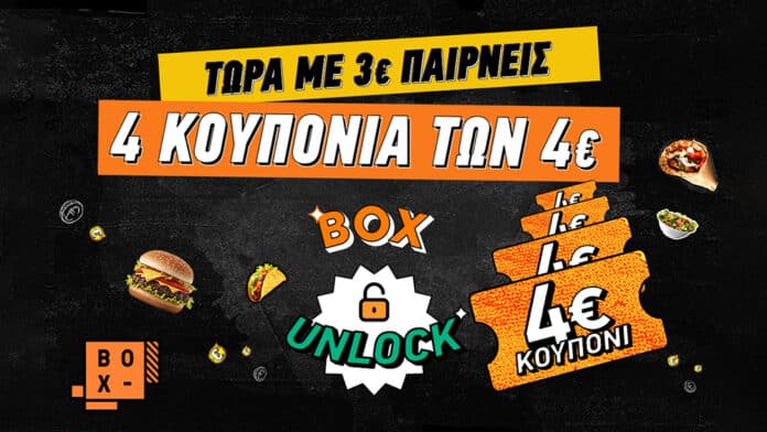 To BOX Delivery App επιστρέφει με την προσφορά ΒΟΧ UNLOCK, που δίνει σε όλους κουπόνια συνολικής αξίας 16€. Μέχρι τις 16 Νοεμβρίου, οι χρήστες του BOX, δίνοντας 3€, μπορούν να ενεργοποιήσουν την προσφορά και να αποκτήσουν 4 κουπόνια των 4€ το καθένα, για να τα αξιοποιήσουν σε παραγγελίες φαγητού, καφέ, γλυκού ή ό,τι άλλο επιθυμούν.