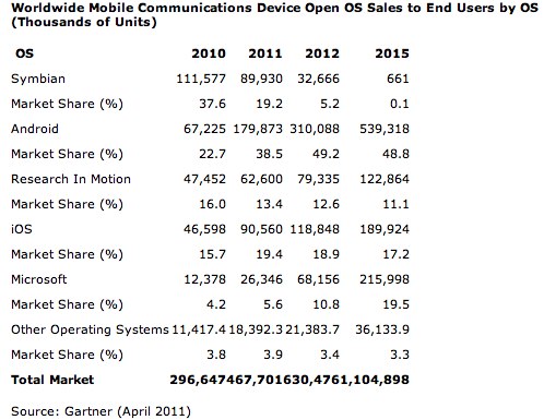 Στο δελτίο τύπου που εξέδωσε η Gartner πάντως, μιλά για επικράτηση των smartphones που χρησιμοποιούν “ανοιχτό λειτουργικό” σε συνολικό ποσοστό της τάξης του 47% μέχρι το 2015, που αντιστοιχεί σε 1 δισεκατομμύριο συσκευές παγκοσμίως. Η εκτίμηση των αναλυτών της είναι πως μέχρι την χρονιά εκείνη, το 67% των συσκευών που θα κυκλοφορούν θα έχουν τιμή περί τα 300$. Με λίγα λόγια, εξαιτίας της προσπάθειας των κατασκευαστών να αποκτήσουν μεγαλύτερο μερίδιο αγοράς, ο ανταγωνισμός θα περάσει στις τιμές, κάνοντάς τες, σαφώς πιο “δημοκρατικές“.