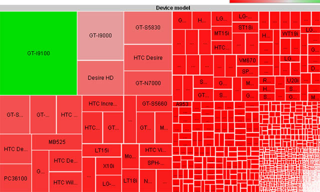 Εξετάζοντας την κατανομή των συσκευών στα διαγράμματα -που μπορείτε να δείτε αναλυτικά εδώ μαζί με κάποια άλλα ενδιαφέροντα δεδομένα- αξίζει να δοθεί έμφαση στο εντυπωσιακό κομμάτι που καταλαμβάνει η Samsung, αντιπροσωπεύοντας το 40% του συνόλου, ενώ μόνο του το Samsung Galaxy S II το 10%.