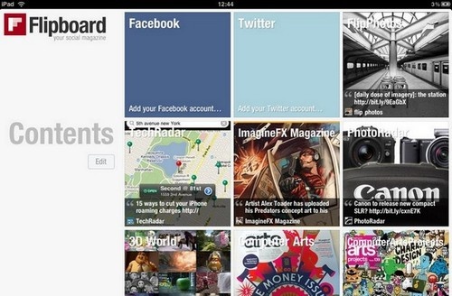 To Flipboard είναι στην ουσία ένα social magazine από το οποίο μαθαίνεις τα νέα για ό,τι σε ενδιαφέρει. To Flipboard οργανώνει τις εισερχόμενες πληροφορίες από διάφορες πηγές, όπως είναι οι Google Reader, Twitter, Facebook και Flickr, ανάλογα με τις προτιμήσεις σας και σας επιτρέπει να δείτε τους ανθρώπους, τις λίστες, τα γκρουπ και τα blog που σας ενδιαφέρουν. Έχει όμορφο interface και υψηλό επίπεδο διαδραστικότητας, ενώ ταυτόχρονα προσφέρει άμεσες ενημερώσεις από Twitter και Facebook, αγαπημένες φωτογραφίες από Flickr, πρωταγωνιστικά άρθρα στο Google Reader και πολλά άλλα.