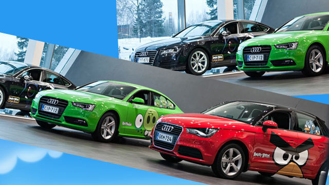 Κι όμως! Rovio και Audi παρουσίασαν τρεις εκδόσεις των μοντέλων A5 και Α7 της γερμανικής αυτοκινητοβιομηχανίας, καλυμμένες από προφυλακτήρα σε προφυλακτήρα με artwork από το παιχνίδι: το Audi A5 έχει πάνω το κόκκινο «θυμωμένο» πουλί ενώ από ταAudi A7, το ένα έχει επάνω του γουρούνια και το άλλο είναι εμπνευσμένο από το Angry Birds Star Wars.
